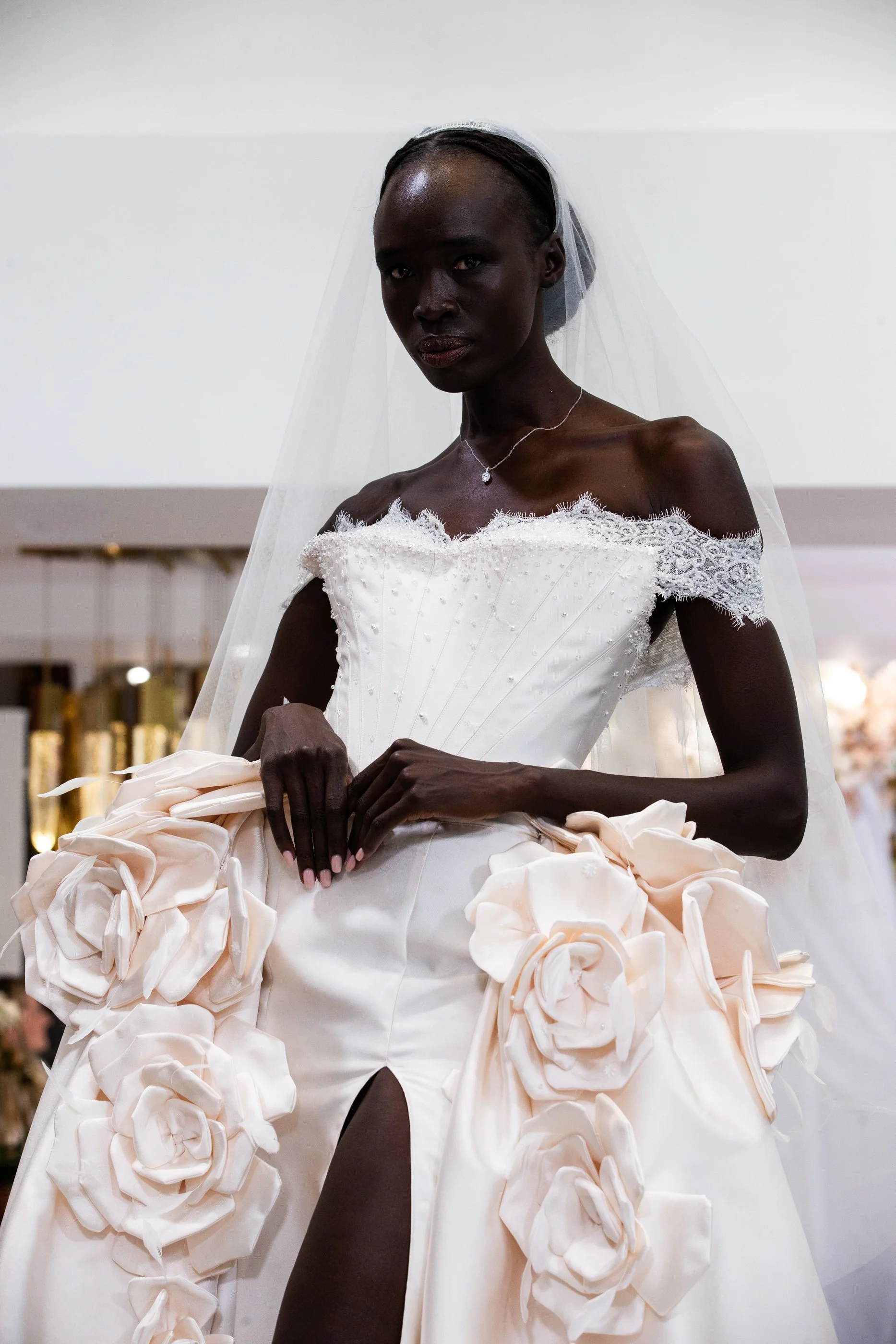 Fit and flare gown in Rose Ivory silk Mikado, featuring a high slit and structured corset. Highlighting neckline is a demi cup of delicate beaded Chantilly Lace that continues through to off shoulder straps. Detachable overskirt- opening at center front- in matching Rose Ivory silk Mikado and finished with silk Mikado 3D flowers at the waist.